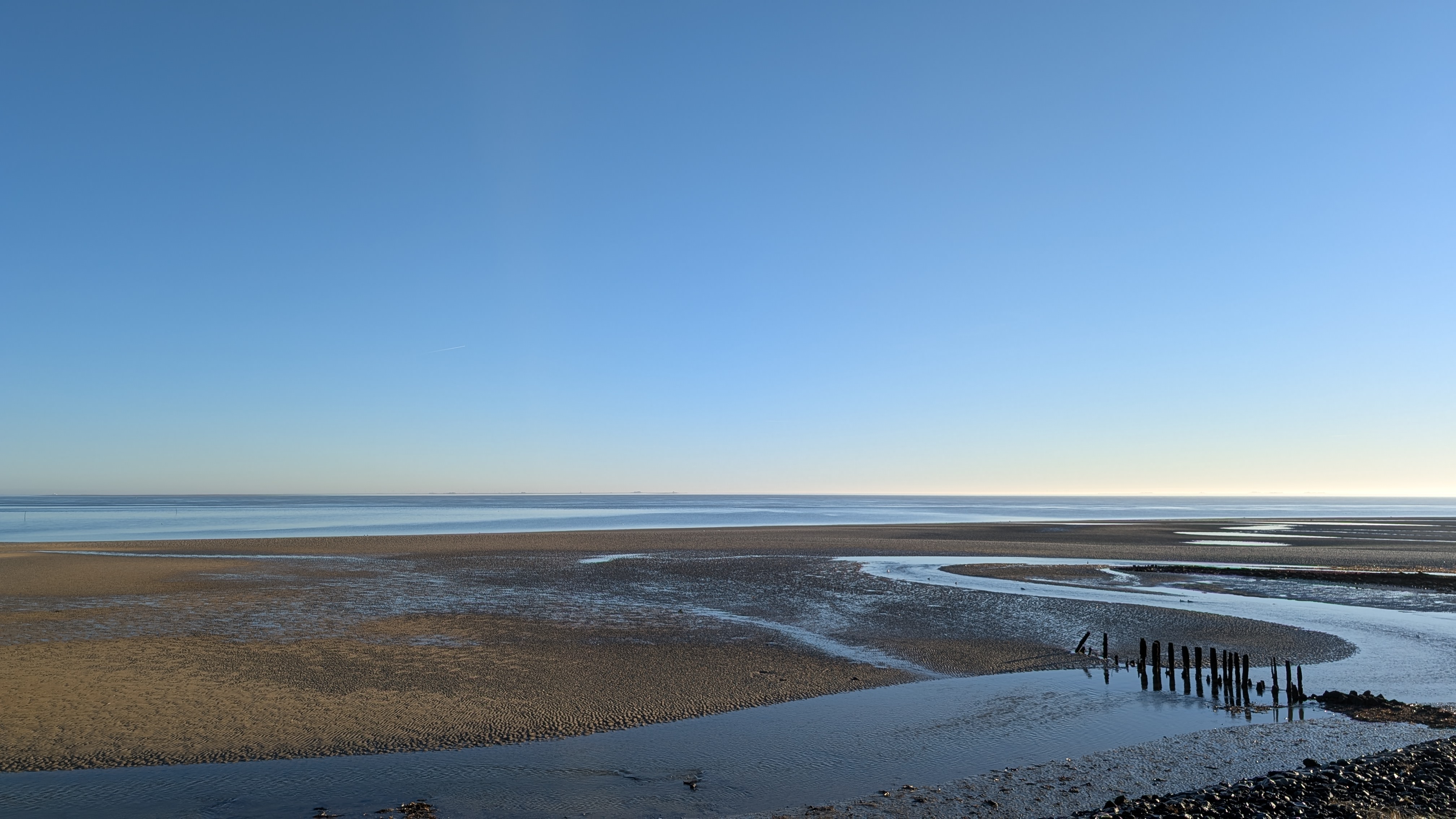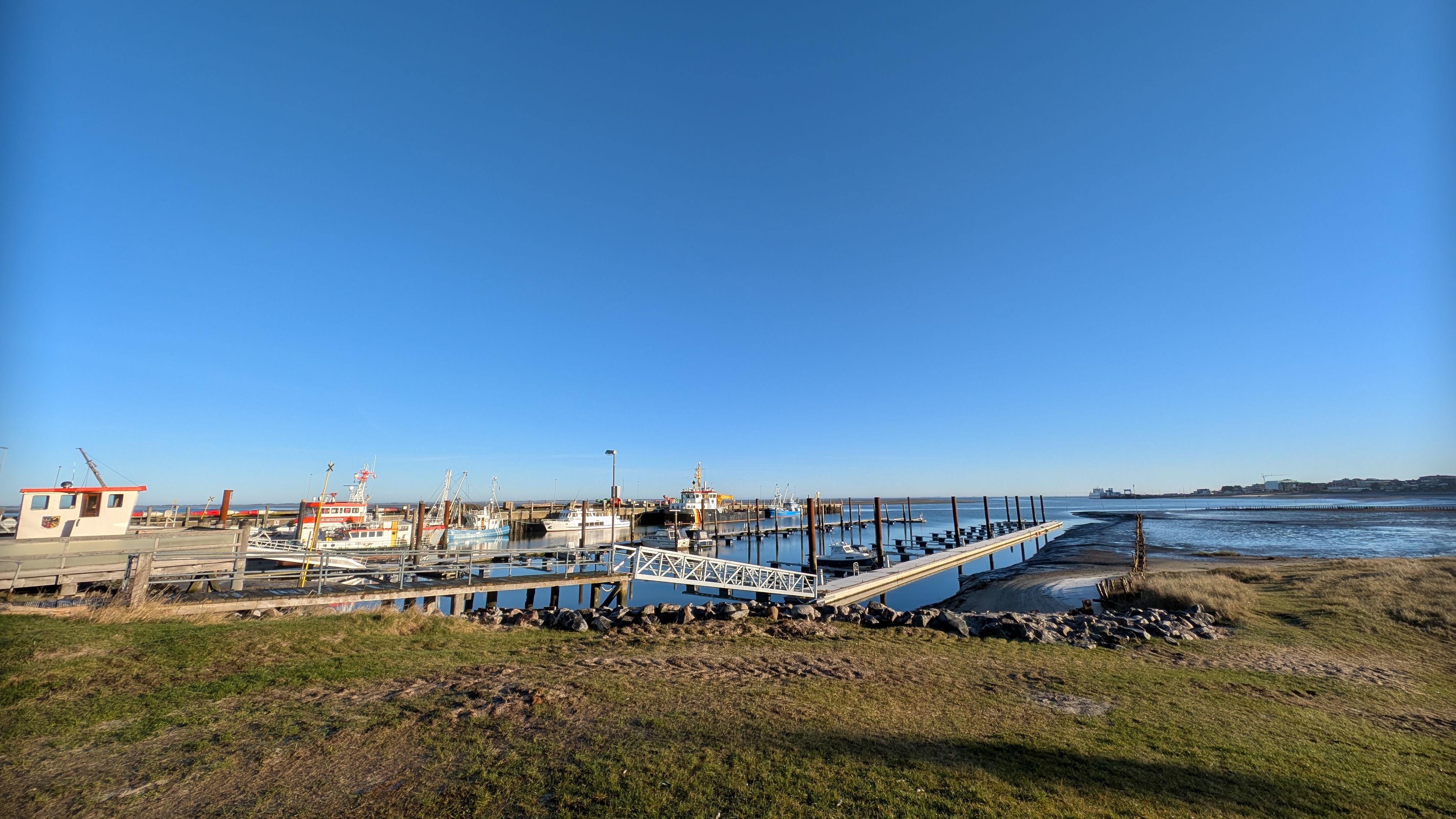 Heute morgen war es richtig kalt. Alle Wege waren mit einem Raureif und einer kleinen Schicht Schneegriesel bedeckt. Das war bisweile ziemlich rutschig. Heute morgen war es tatsächlich absolut windstill - Drohnenwetter. Aber ich würde die Drohne eh nur weit draußen auf dem Kniepsand starten. Und das war mir auf die Schnelle zu weit weg. Am späten Nachmittag wurde es dann etwas grauer und einen schönen Sonnenuntergang wie gestern gab es leider nicht.