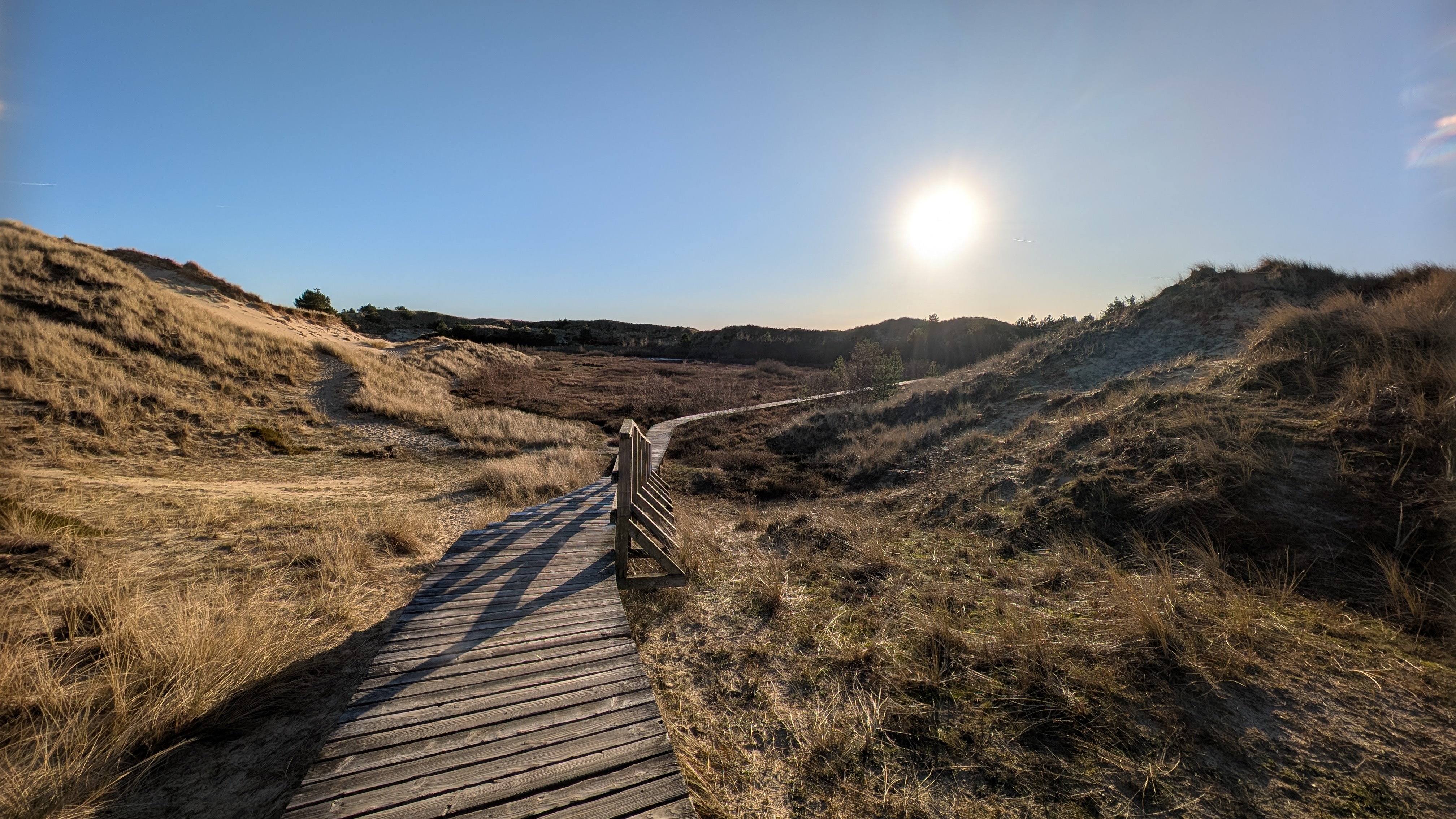Hier noch einige Fotos bei meiner Dünenwanderung vom letzten Dienstag. Da hatten wir den ganzen Tag schönsten Sonnenschein, die Bohlenwege wieder voller Raureif, aber die Kälte merkt man nach wenigen hundert Meter gar nicht mehr. Die Wanderung ging über die halbe Insel, von Wittdün an die Steenodder Mole, dann hinüber zur anderen Seite, Richtung Leuchtturm, Zeltplatz, am Wriakhörnsee vorbei wieder zurück nach Wittdün.